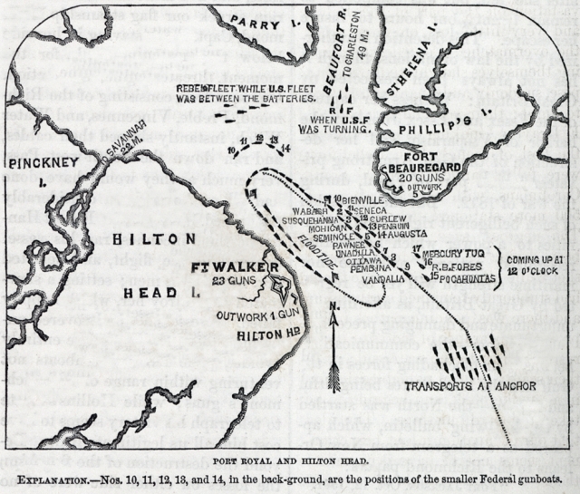 On the morning on 7 November. The fleet’s main target was Fort Walker to the south of the bay. The first shots were fired at 9:30 in the morning, and firing continued until 1:15, when the Confederate garrison there was seen to be leaving the fort. Fort Beauregard was abandoned soon after the Federal occupation of Fort Walker. Although it had not suffered as much damage, it was clear that the battle was lost and that the fort would not be able to keep the Union fleet out of Port Royal Bay.