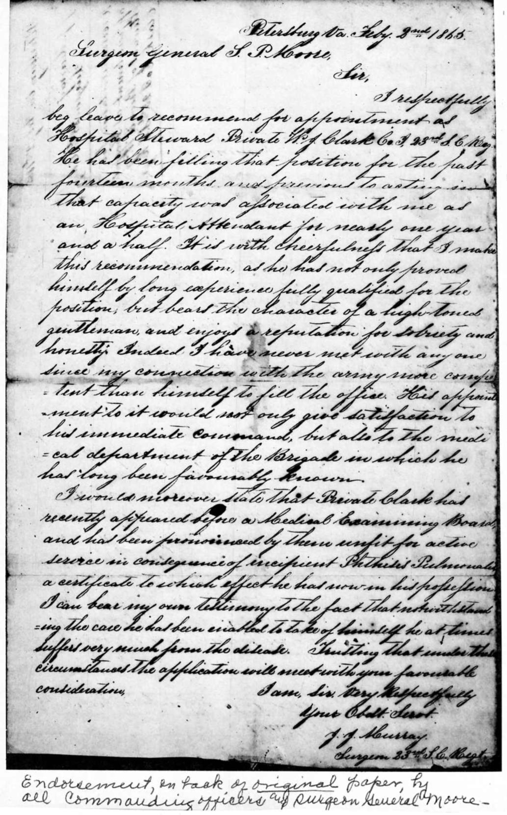 William James was wounded and suffered from extreme exposure near Petersburg, Virginia in January 1864 and was sent to the Base Hospital C.S.A. in Petersburg, Virginia. While recovering from his wounds he began serving in the Hospital as Steward. His wounds rated him a discharge but he chose to stay and be of service in any way he could. The 23rd Regiment Surgeon at the time J.J. Murray wrote a letter to the Surgeon General J.P. Moore on 2nd. February 1865 for a formal appointment as Hospital Steward to the Base Hospital C.S.A. in Petersburg, Va. A position he had been serving for the past 14 months during his recovery. In his endorsement he was described as “Bears the character of a high-toned gentleman and enjoys a reputation for sobriety and honesty”. His appointment was signed by all his Commanding Officers and the Surgeon General J.P. Moore.